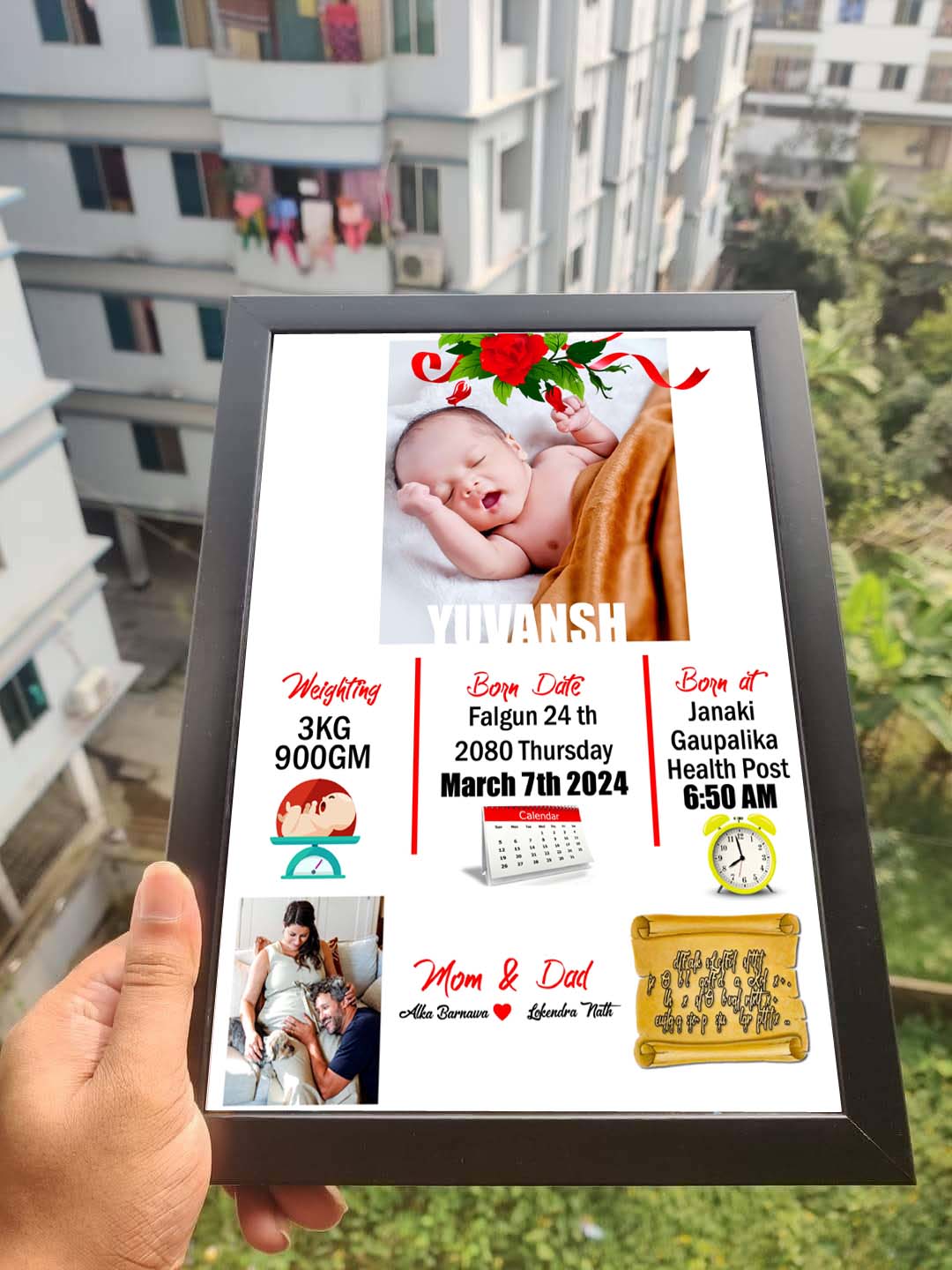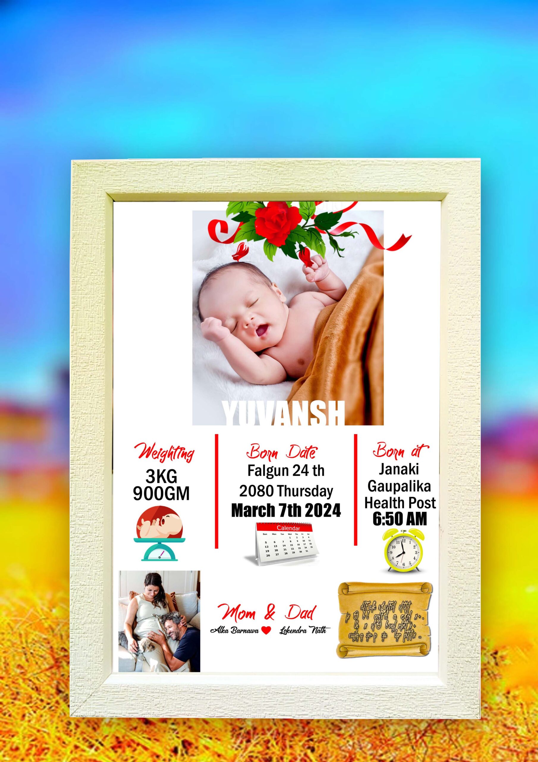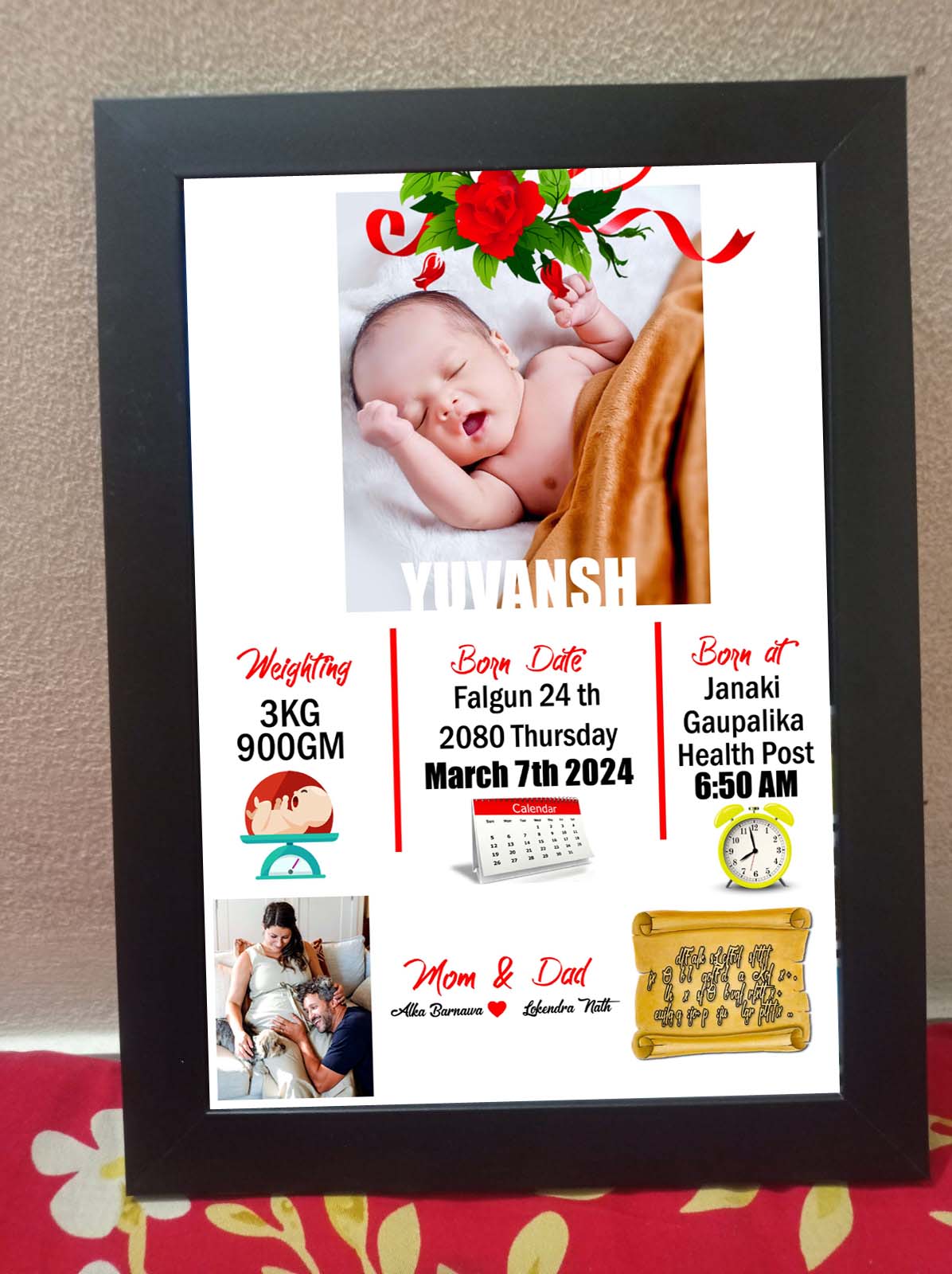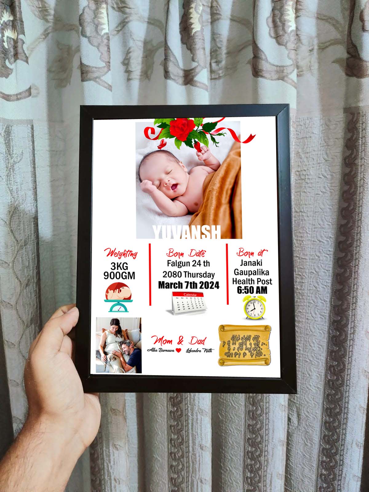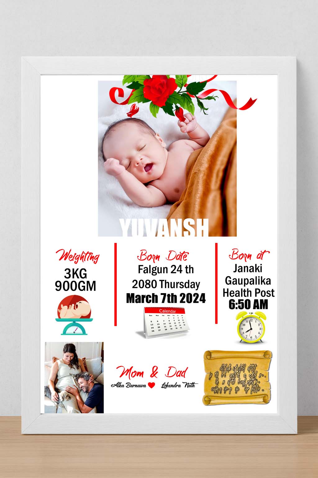 This elegant frame is designed to capture all the precious details of your newborn, creating a timeless memory for your home or as a heartfelt gift.