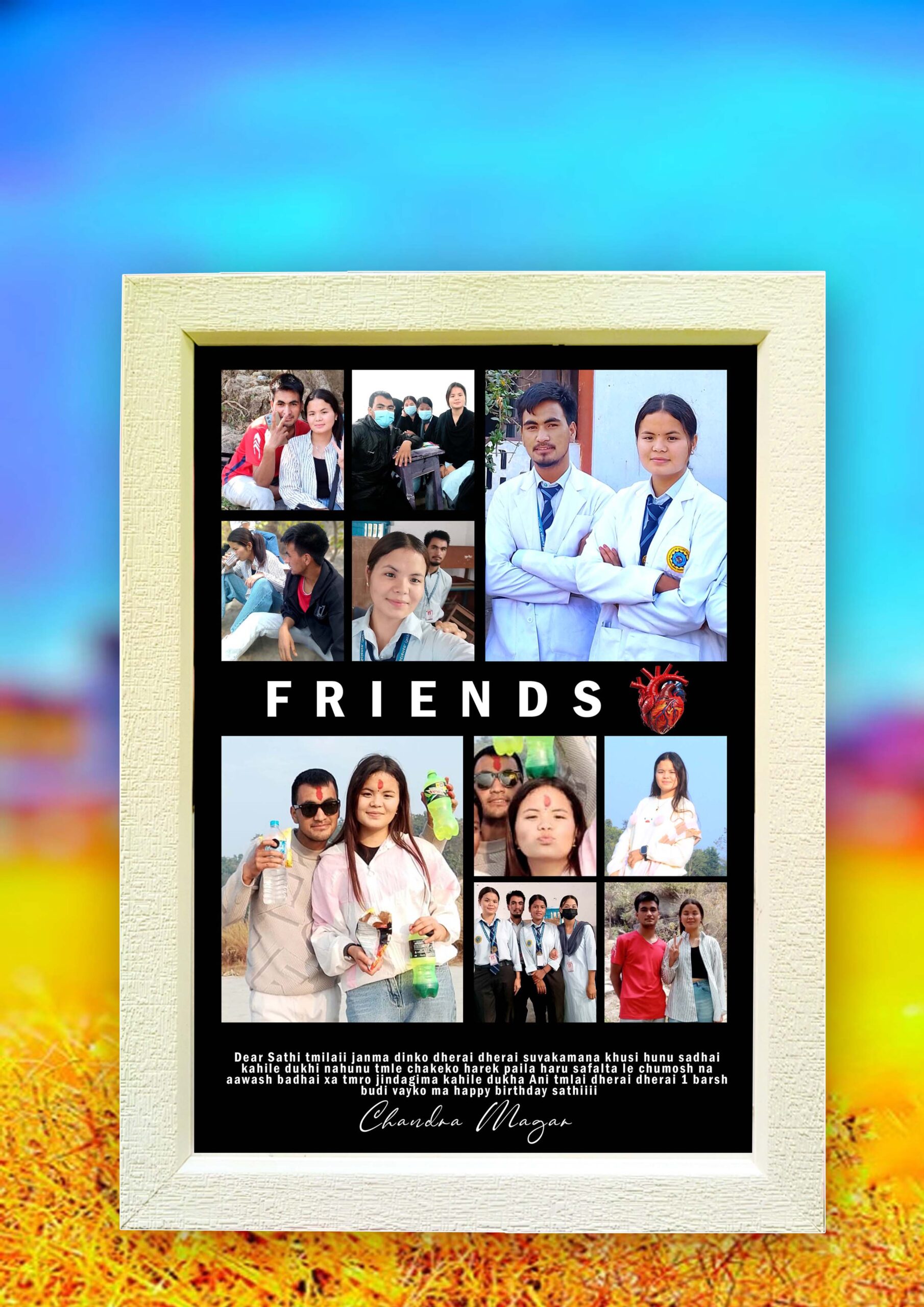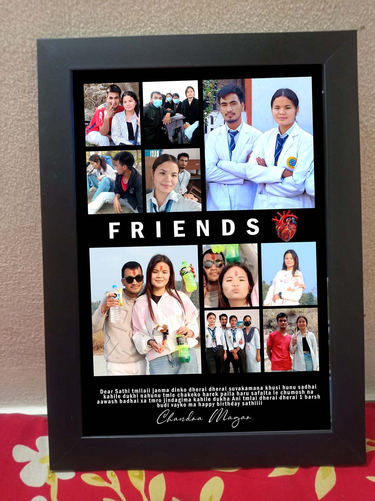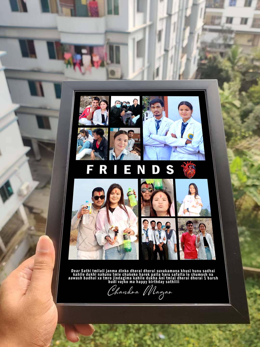 A premium personalized friends photo frame with multiple photos, custom message & name. Perfect gift for birthday, friendship day & memories.